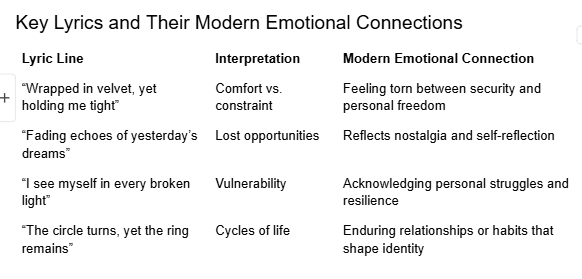 The texts also use repetition and metaphor to reinforce central themes. For example, the reference to the "velvet ring" can symbolize both comfort and limitation, reflecting the complexity of modern emotional experiences. By incorporating such double meanings, the song allows for multiple interpretations, making it relevant to different audiences and increasing its cultural resonance.