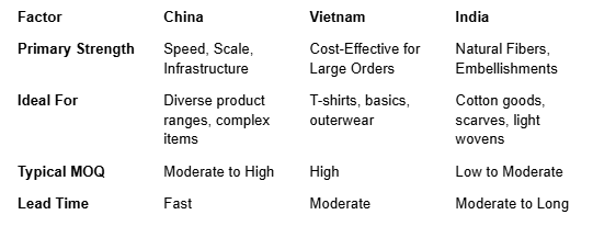 This table compares China to other major hubs. Use it as a key to assess the country that best suits your brand’s particular demands.
